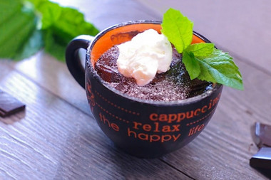 Вылейте тесто в кружку, пригодную для СВЧ-печей, по желанию на данном этапе можете положить в массу пару кусочков шоколада или орешки. Тесто должно занимать примерно половину кружки, если будет больше, оно может убежать. Поставьте кружку в микроволновку на максимальную мощность примерно на 3 минуты, важно следить за процессом, чтобы успеть вовремя выключить печь, если тесто начнет переливаться.
