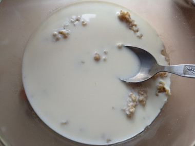 Достаньте миску из микроволновой печки (аккуратно, не обожгитесь!!!) и влейте молоко. Хорошенько перемешайте, так как каша может прилипнуть ко дну и затем пригореть.