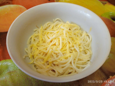 Для этого блюда я тоже взяла спагетти, только поломала их на 3-4 части. Варила в специальной пластиковой кастрюльке для микроволновки. Техника у меня не очень мощная, всего 750 Вт. Поэтому времени на закипание воды понадобилось побольше. А вот варились спагетти ровно 10 минут (8+2). Воды совсем не осталось, сливать было нечего. При этом спагетти не разварились, остались "рассыпчатыми" и полностью готовыми. Переложила их на тарелку, посыпала сыром и ещё прогрела 30 секунд в микроволновке. Результатом довольна, все получилось!