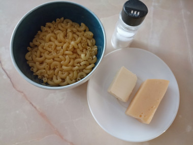 Как сварить макароны в микроволновке с сыром? Подготовьте все необходимые продукты. Макароны подойдут любой формы: фузилли, пенне, конкильони, бантики и другие. Берите макароны из твердых сортов пшеницы, - они полезнее. У меня спагетти - их любят мои дети, но я их поломаю на несколько частей. Также для приготовления в СВЧ я рекомендую макароны, которые варятся недолго. Сыр может быть любых сортов: и твердых, и мягких, моцарелла и даже сыр с плесенью.