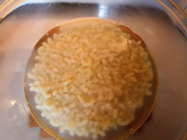 Макароны, как правило, кладут в кипящую воду, поэтому нам надо довести воду до кипения. Поставьте тарелку в микроволновую печь примерно на 3-5 минут. При мощности 1000 в моей микроволновке вода закипела за 5 минут