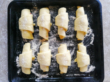 Положите начинку (или варенье, или шоколад с орехами) и скрутите рогалики. Переложите их на подготовленный противень.