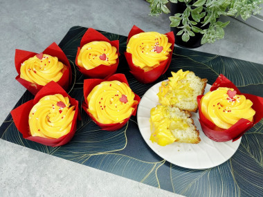 1. В пирожных сверху посередине делаем углубление и заполняем его лимонным курдом. С помощью пекарского пакета и любой понравившейся насадки украшаем капкейки сверху сливочным кремом.