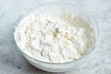 8. Теперь нужно также понемногу добавлять дрожжи и оставшуюся муку, чередуя их и не забывая хорошо перемешивать тесто после каждой порции.