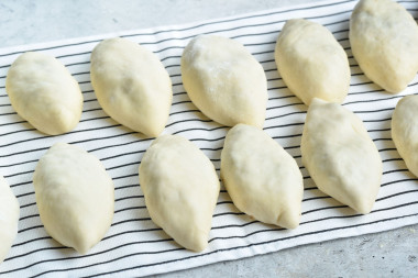 13. Пирожки выкладывайте на противень или прямо на стол. Слепленные пирожки нужно накрыть полотенцем и дать им постоять минут 10-15.