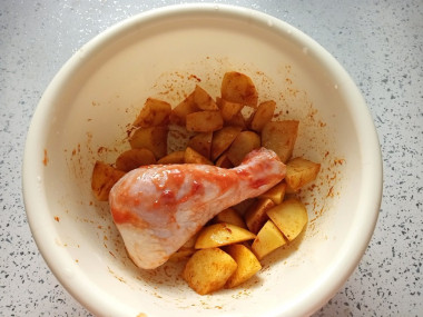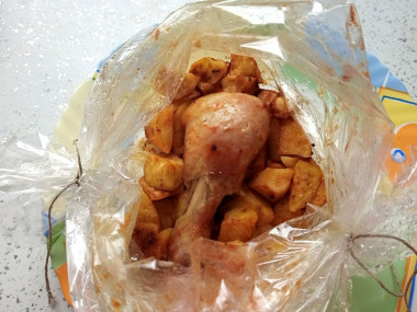 5. В пакет для запекания положите картофель, сверху на него подготовленные окорочка. Завяжите пакет, сделайте в нем несколько проколов.