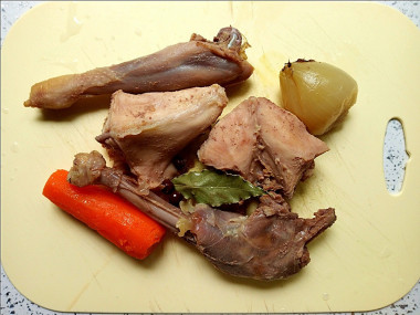Положите в бульон целиком луковицу и морковь. Варите его еще 15-20 минут.