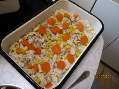 Только я , в конце, перед тем как разложить мясо, добавлю ещё морковки на дно, консервированного горошка, консервированной кукурузы и зелень... хочется разноцветного чего-то)))