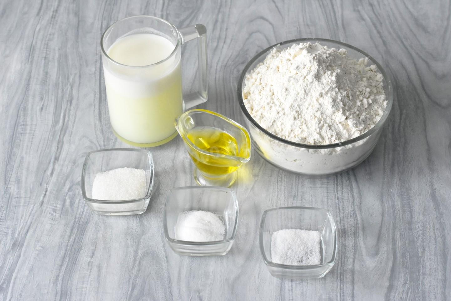 Для начала подготовьте необходимые ингредиенты по списку. Муку используйте высшего сорта. В этом рецепте используется молочная сыворотка. Но также подойдет и сыворотка на кефире.