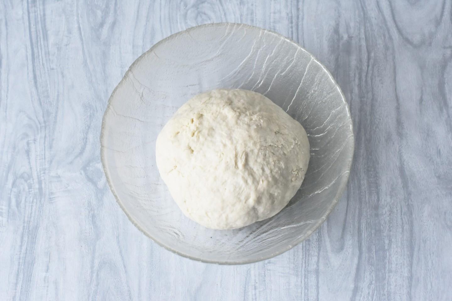 Готовое тесто скатайте в шар, выложите в миску и затяните пищевой пленкой. Оставьте при комнатной температуре на 20-30 минут. За это время в муке разовьется клейковина, и готовое тесто получится эластичнее и податливее.