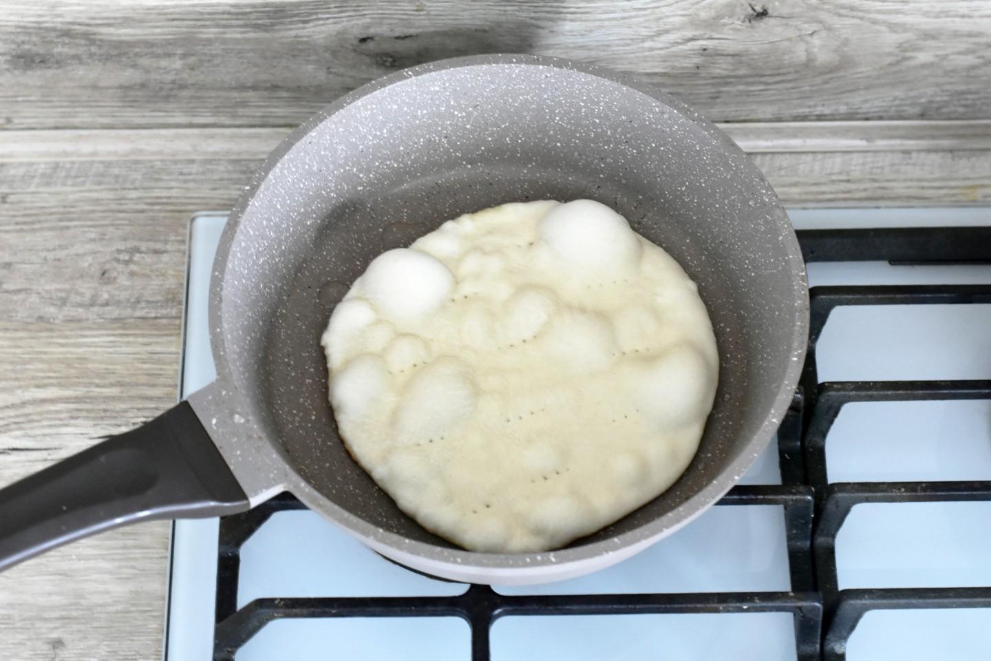 В сковороде на среднем огне разогрейте часть растительного масла. Выложите заготовку и сделайте вилкой несколько проколов. Жарьте лепешку до румяной корочки и появления на поверхности воздушных пузырьков на умеренном огне около 2-5 минут. Затем переверните и продолжите обжаривание до румяной корочки. Обжарьте все остальные лепешки. Как правильно выбрать сковороду и масло для жарки можно узнать из отдельных статей. Ссылки в конце рецепта.