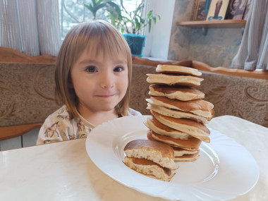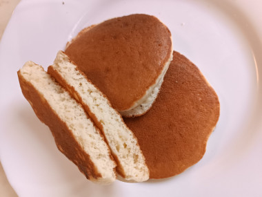 Нашла на сайте рецепт оладьев на кефире без масла быстро и вкусно. Это просто идеальные оладьи для моего мужа, который старается не употреблять в пищу жиры. Для замеса теста я взяла кефир 1%, предварительно немного подогрела его до комнатной температуры. Белки взбивала в первую очередь, добавив часть сахара и соль. От себя добавила к белкам лимонный сок во время взбивания. С желтковой массой перемешивала лопаткой. Старалась сильно не месить, чтобы пузырьки воздуха не схлопнулись. Получилось текучее, но воздушное тесто. Оладьи жарила на сухой блинной сковороде. От плиты лучше не отходить, т. к. оладушки жарятся очень быстро. Крышкой накрывала только после переворачивания. Оладьи получились пышными, сочными и при этом не влажными. Очень похожи на бисквиты. Вкусны они и просто так и с разными добавками. Например, со сметаной и мёдом.