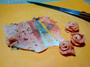 Кету разрежьте на две части и удалите хребтовую кость. Также вырежьте плавники и по возможности подчистите косточки. Если есть желание, можете срезать тонким ножом всю кожу, оставив только филе.