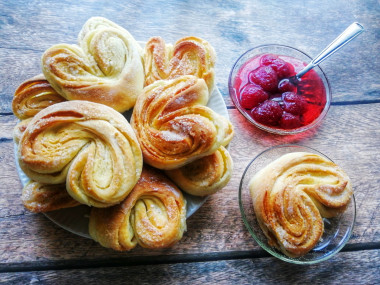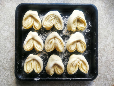 Расправьте края и сформируйте сердечко. Таким образом сформируйте все пирожки с сахаром. Сверху я смазала их оставшимся маслом и ещё раз посыпала сахаром. При желании можете смешать сахар с корицей. Выложите пирожки на противень застеленный пергаментной бумагой. Правильно выбрать пергаментную бумагу вы сможете, прочитав отдельную статью про особенности пергамента, ссылка есть в конце рецепта.