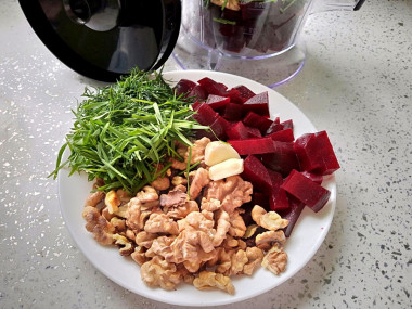 Как сделать пхали из свеклы по-грузински с орехами? Подготовьте необходимые ингредиенты. Орехи берите качественные, без горчинки, от вкуса орехов будет зависеть вкус готового блюда. Свеклу выбирайте сочную, яркую, сладкую - у меня именно такая. Орехи промойте, просушите на бумажных полотенцах, можно немного обжарить на сковороде, так будет ароматнее и вкуснее. Поместите орехи в чашу блендера, можно воспользоваться мясорубкой, но мне удобнее блендером.