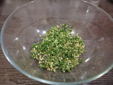 Зелень промойте, просушите, порежьте и отправьте к орехами, измельчите и переложите получившуюся массу в миску.