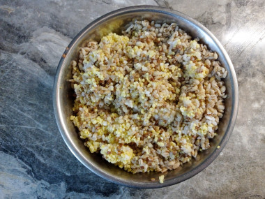 Следующим всыпьте промытое пшено, на него выложите оставшиеся грибы. Последним слоем идет рис. Посолите и поперчите блюдо по вкусу. Можете добавить свои любимые приправы.