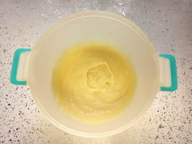 Переложите яблочное пюре в чашу блендера и взбейте. Добавьте манку и снова всё вместе взбейте. Также можно воспользоваться погружным блендером.