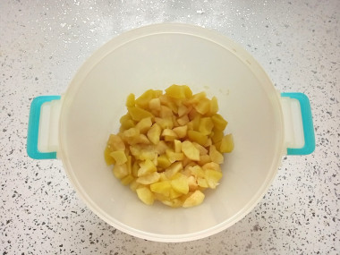 Помойте и почистите яблоки от кожуры, разрежьте их на четвертинки, удалите семенные коробочки, плодоножки.