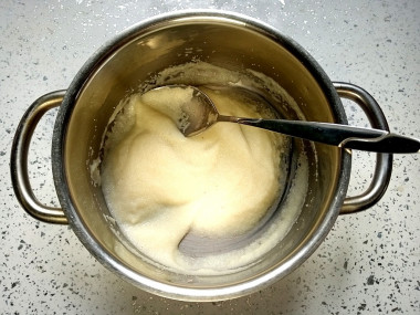 Манку в горячее молоко я побаиваюсь добавлять. Поэтому смешала ее с холодным молоком, сразу добавила сахар и ваниль на кончике ножа. Смесь загустела быстро. Взбила ещё раз яблочное пюре с манкой.