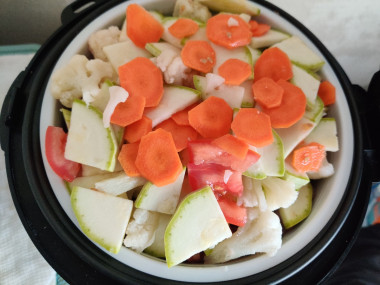 Возьмите корзину для варки на пару. На самый низ выложите кусочки индейки. Поверх нее положите нарезанные овощи, в том числе и замороженные. Посолите их. В чашу мультиварки налейте чистую воду. Установите корзину с мясом и овощами.