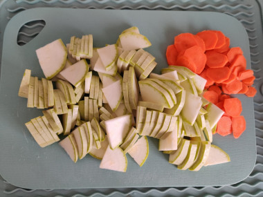 Кабачок нарежьте также на кружочки или половинки кружков, в зависимости от размера. Для приготовления на пару лучше возьмите молодые кабачки — они получатся вкуснее. Если же у вас зрелый плод, то очистите его от кожуры и семян. Молодые кабачки чистить не нужно.