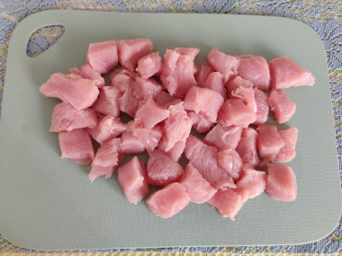 Мясо обмойте, обсушите и нарежьте на небольшие кусочки поперек волокон — так оно будет мягче. Посолите и сдобрите индейку специями. Я использую черный молотый перец и карри. Вы берите специи по своему вкусу.