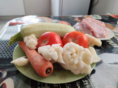 Спасибо автору. После периода шашлыков захотелось чего-то лёгкого. И...Вуаля...Решила приготовить индейку на пару в мультиварке. Подготовила ингредиенты, помидор один не использовала, потому что овощей и мяса было и так много. Из специй выбрала французские травы, чеснок и перец, немного соли. В мультиварке индейка провела у меня чуть больше часа. Получилось очень нежное, лёгкое, диетическое блюдо. Мягкая сочная индейка отлично сочетается с молодым кабачком и яркой морковкой, цветная капуста и помидор добавляют блюду изысканности.