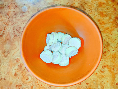 Осталось собрать журек. Белые колбаски нарежьте произвольными кусочками. Отправьте в глубокую тарелку.