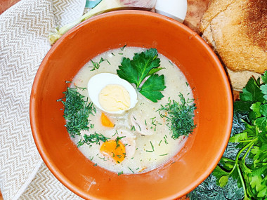 Это стародавний польский суп Журек (жур). Изюминкой здесь выступает хлебная закваска с чесноком и лавром на ржаной муке (цежа - по-польски). На мой взгляд, это великолепная гастрономическая находка сельских бедняков, кстати. Это теперь в ресторанах подаётся.) Суп наваривается на белой польской колбасе сырой (у меня куриная для гриля). Я положила в бульон картофель и морковку, как это делали в граничащей с Польшей Белоруссии. Добавляется сушёный майоран и чеснок, получается оригинальный вкус. Затем суп обогащается ещё обжареной копчёной колбасой со свинной грудинкой (в моём случае - бекон). И заливается цежа в суп со сметаной. Я настоивала цежу 5 дней, просто на столе. Она получается шикарной. Приятная ржаная кислинка с чесночным намёком. Суп получается консистенции лёгкого киселя. При подаче варёные колбаски нарезаются, добавляется варёное яйцо, порционно, зелень. Новый, необычный, интересный вкус супа. Попробуйте!