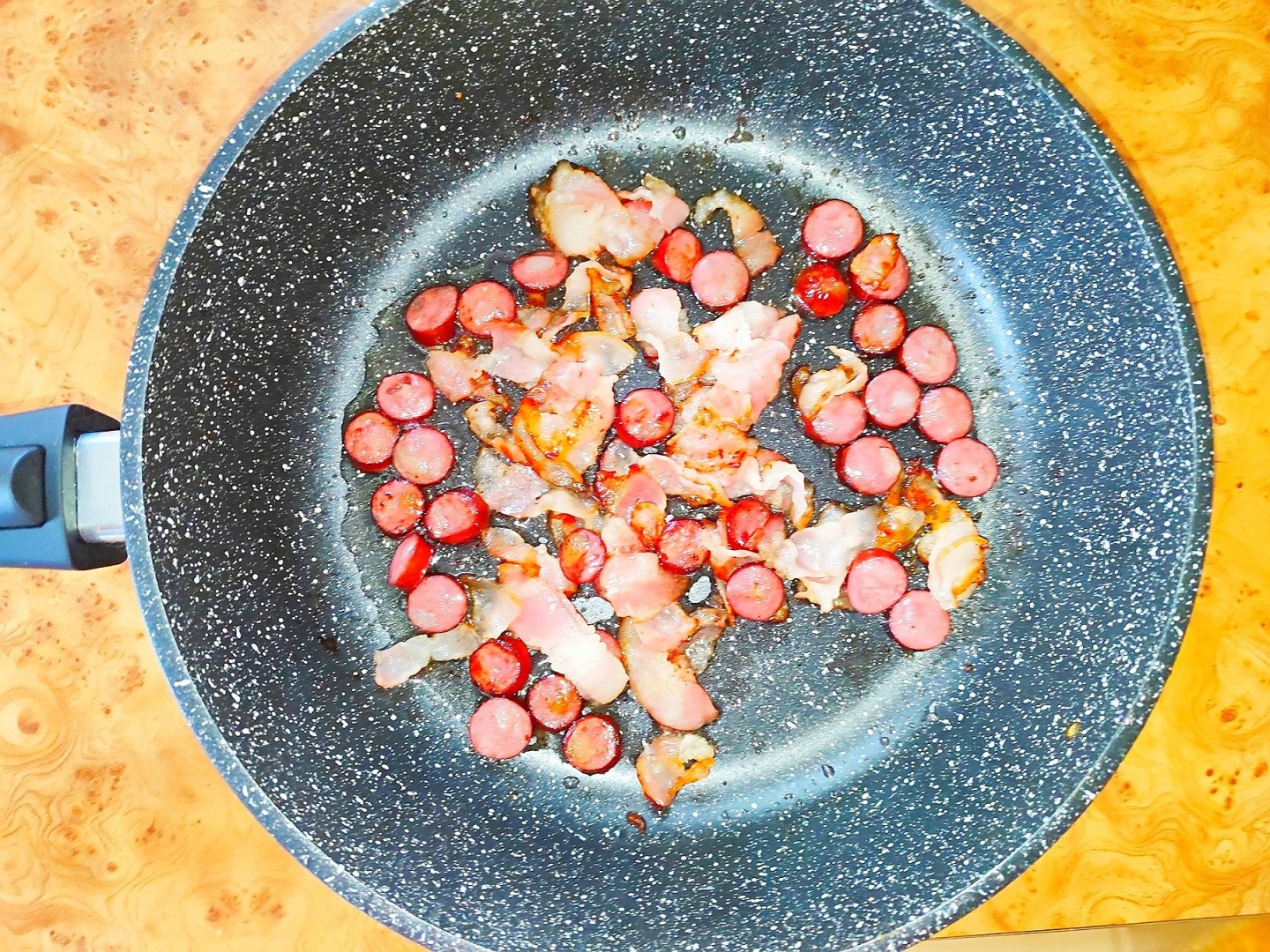 Подготовьте остальные продукты. Копчёную колбасу и грудинку нарежьте небольшими кусочками. Обжарьте до готовности.