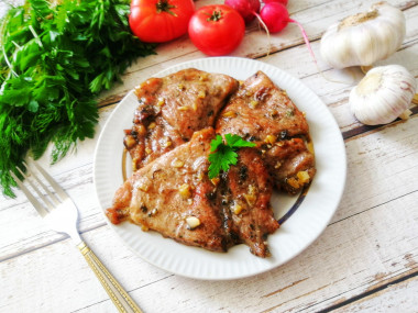 Выложите отбитое мясо на пергамент. Сверху полейте его маринадом. Он сохранит блюдо от пересыхания при запекании. Старайтесь поливать именно мясо, а не бумагу. Поставьте свинину в разогретую до 180°С духовку и запекайте ее около 35 минут. Затем включите верхний гриль и подрумяньте ее в течение примерно 10 минут. Точное время зависит от вашей духовки. Узнать об особенностях работы духовок можно, прочитав отдельную статью, ссылка в конце рецепта.