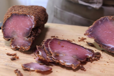 Готовая говядина должна быть твёрдая на ощупь, но в то же время упругая. Домашняя пастрами готова.