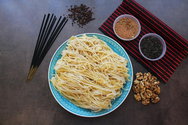 Разогрейте сковороду на среднем огне, смазывать ее ничем не надо. Быстрыми движениями наносите на сковороду ниточки теста, держите их буквально 5-7 секунд. Как только его возможно будет подцепить лопаткой, сразу снимайте и наносите следующую партию. Удобнее всего это будет сделать на сковороде с антипригарным покрытием.