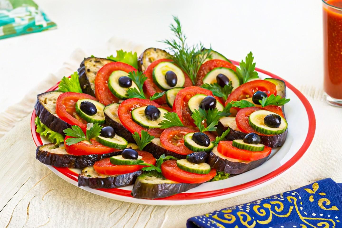 Порежьте кружочками огурцы. Оставшиеся баклажаны красиво выложите в форме павлиньего хвоста, смажьте заправкой, выложите помидоры. На кружки помидоров положите кружочки огурцов.