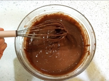 Всыпьте оставшуюся муку с какао и перемешайте тесто до полного исчезновения комочков. Я размешивала сначала лопаткой, затем венчиком.
