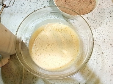 Яйца вбейте в другую миску. Всыпьте к ним сахар и щепотку соли — она послужит усилителем вкуса. Взбейте яйца с сахаром до пышной светлой массы. О том, как правильно взбивать яйца, читайте в статье по ссылке в конце рецепта.