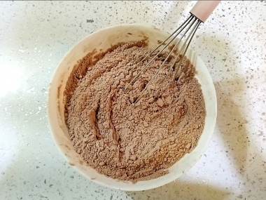 Сразу включите разогреваться духовку на 170°С, режим верх-низ. Возьмите миску и просейте в нее сухие ингредиенты — муку, какао, соду и разрыхлитель. Этим вы не только уберете возможный мусор, но и разобьете все комочки, что сделает муку и какао воздушнее. Перемешайте сухие ингредиенты. Подробнее о свойствах муки и нюансах работы с содой и разрыхлителем читайте в отдельных статьях по ссылкам в конце рецепта.