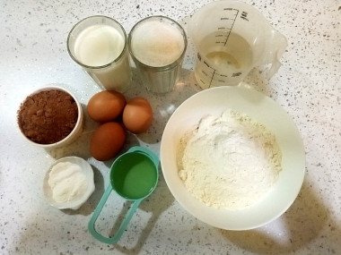 Как сделать пышный шифоновый бисквит шоколадный для торта? Подготовьте продукты. Какао у меня алкализованный, он насыщеннее и ярче, но подойдет и обычный. Растительное масло без запаха, молоко — жирностью 2,5%. Воду лучше взять из фильтра, чтобы не было привкуса. Все продукты должны быть комнатной температуры, тогда бисквит лучше поднимется и будет пышнее. Если вы не успели достать их из холодильника, то положите яйца в теплую воду, а молоко подогрейте.