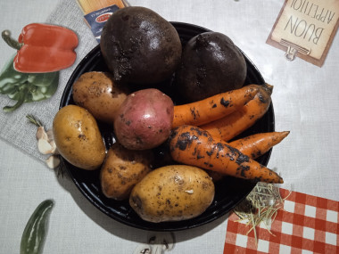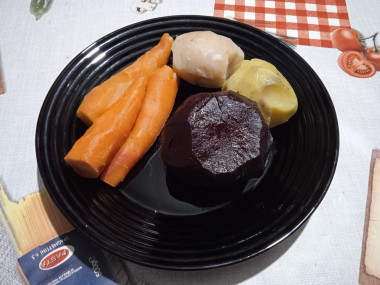 У меня мощность микроволновки 800 Вт. Я поставила на максимальный нагрев на 6 минут. Затем перевернула овощи и вернула в микроволновку еще на 4 минуты. Морковь и картофель готовы. Их можно вынуть. Для готовности свеклы весом 300 гр мне потребовалось еще 5 минут. Время указано приблизительно, так как оно будет зависеть от мощности и особенности работы вашей микроволновки, а также размера овощей. Подробнее об этом читайте в статье по ссылке в конце рецепта.