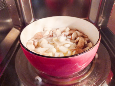 Закиньте грибы и лук в бульон. Накройте кастрюлю специальной крышкой для микроволновки, с дырочками для выхода пара. Если такой у вас нет, то обычной тарелкой. Оставьте небольшую щель, чтобы выходил пар.