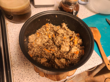 Получилось очень вкусно! Сначала обжарила мясо на режиме "Жарка" с открытой крышкой, потом добавила лук и натёртую морковь, обжарила ещё 5 минут, добавила гречу, чеснок, приправы. Залила кипятком и в режиме "Тушение" готовила 30 минут. Думаю, можно было готовить и 15 минут, как у автора рецепта. У меня получилось всё ооочень разваренное. Лук с морковкой практически растворились, мясо (брала свиную шею, нарезала мелкими кубиками) при прикосновении вилки тоже распадалось. Это невероятно сочное и вкусное блюдо! А аромат какой шел вместе с паром из клапана мультиварки! И, главное, не надо стоять у плиты, умная помощница всё сделала за Вас. Отличный, сытный рецепт Гречка по купечески в мультиварке со свининой, готовьте с удовольствием!