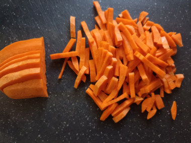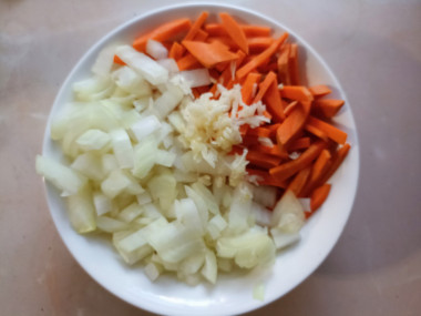 В это время подготовьте овощи. Помойте и почистите морковь, порежьте брусочками или кубиками. Лук очистите от шелухи, нарежьте мелко. Очищенный чеснок порубите или пропустите через пресс.