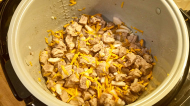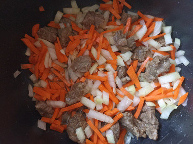 Примерно через 20 минут после начала тушения мяса положите в чашу мультиварки лук, чеснок и морковь, перемешайте. Тушите все вместе еще около 5 минут.