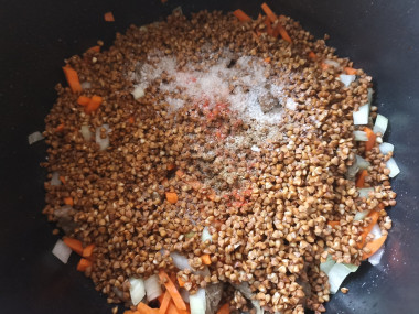 Выложите гречку в мультиварку и залейте водой. Добавьте специи на свой вкус. Я никакие специи не добавляла. так получается тоже очень вкусно. Еще немного посолите. Все хорошо перемешайте. Закройте мультиварку крышкой. В режиме "Тушение" готовьте все вместе 15 минут. Точное время будет зависеть от особенностей работы вашей техники. О мультиварках подробнее читайте в статье по ссылке в конце рецепта.