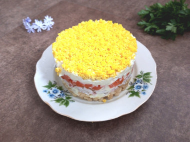 Завершите салат яичными желтками. Поставьте салат примерно на 1 час в холодильник для пропитки.