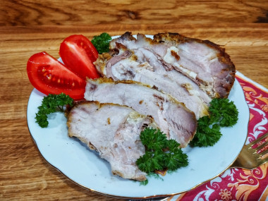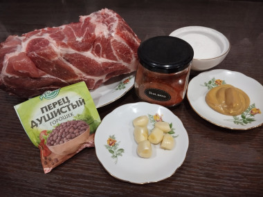 Приготовила свиную шею в рукаве. Подготовила ингредиенты, в мясе сделала надрезы и нечинила мясо пластинами чеснока. Выложила мясо в глубокую чашку. Посолила, поперчила,смазала горчицей( заменила соевый соус). Убрала в холодильник мариноваться на сутки. Затем выложила в рукав для запекания, сделала несколько отверстий небольших для выхода пара и убрала запекаться при 180° на 1 час. Далее открыла рукав и ещё минут десять поддержала в духовом шкафу для подрумянивания.