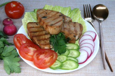 Теперь берём свежие или размороженные стейки тунца, опускаем их в маринад и отправляем на часок в холодильник, чтобы рыба как следует пропиталась. Теперь остаётся только достать рыбу из маринада и зажарить её на гриле. Тунец готовится быстро, достаточно будет обжаривать кусочки по 4 минуты на каждой стороне.