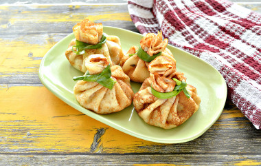 Соберите блин узелком и свяжите его ниточкой сыра (у меня сыр-спагетти, можно взять косичку). Также для связывания подойдет перо зеленого лука (перья лучше предварительно обдать кипятком, чтобы они не рвались при завязывании).
