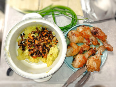 Вареный картофель разомните со сливочным маслом и молоком и смешайте с грибами. Разделите на шесть одинаковых частей.